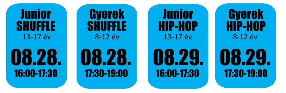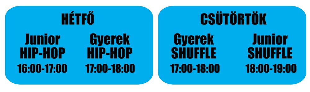 Négy kezdő csoportot tervezünk 2025 szeptemberében indítani: hip-hop/gyerek, hip-hop/junior, shuffle dance/gyerek, shuffle dance/junior